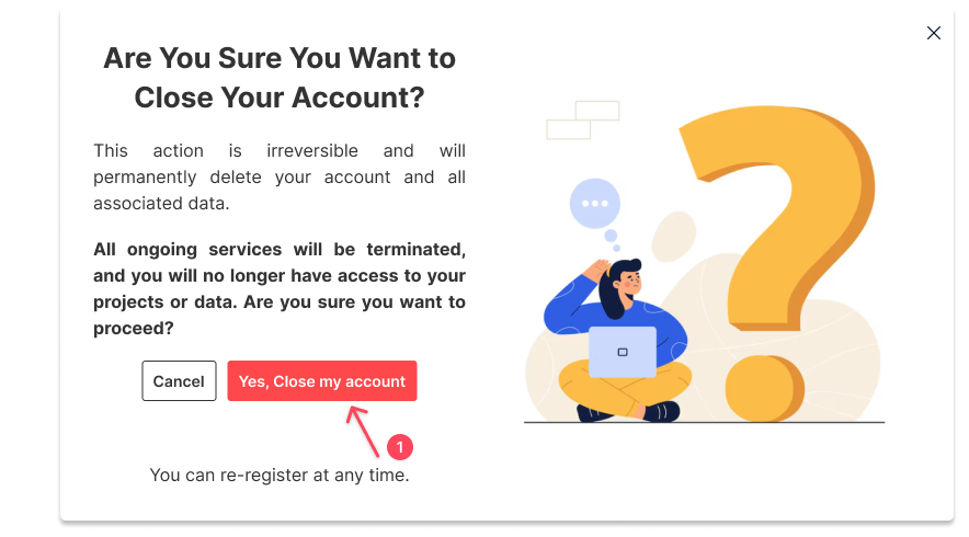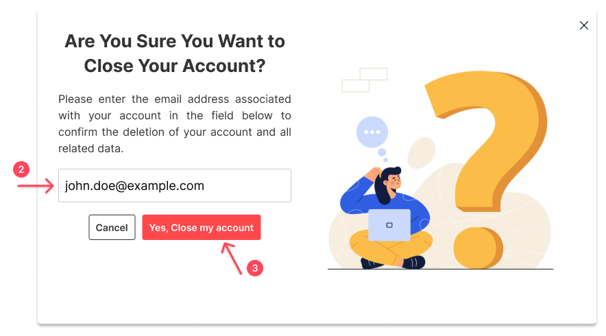 1. Confirm the deletion by entering the email address used in your account (arrow in step 2).